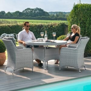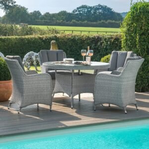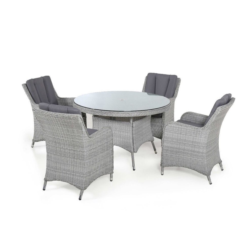The Ascot 4 Seat Round Dining Set is perfect for open-air dining, lounge back in the expertly designed dining chairs featuring back and base cushions for extra comfort surrounding the round table