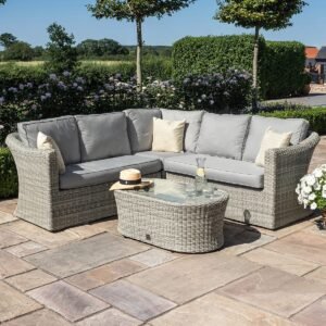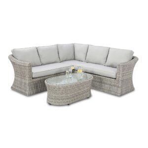 The Oxford range combines the classic weave with a beautiful grey coloured weave that creates a timeless finish. The grey coloured cushions sit perfectly with the weave, creating a modern, elegant style. We recommend storing cushions inside overnight. As with all Maze products, it is made from the highest quality material, woven onto a powder-coated aluminium frame that ensures its use all year. The Oxford Small Corner Group is recognisable for the thick shaped arms and backs to the set.